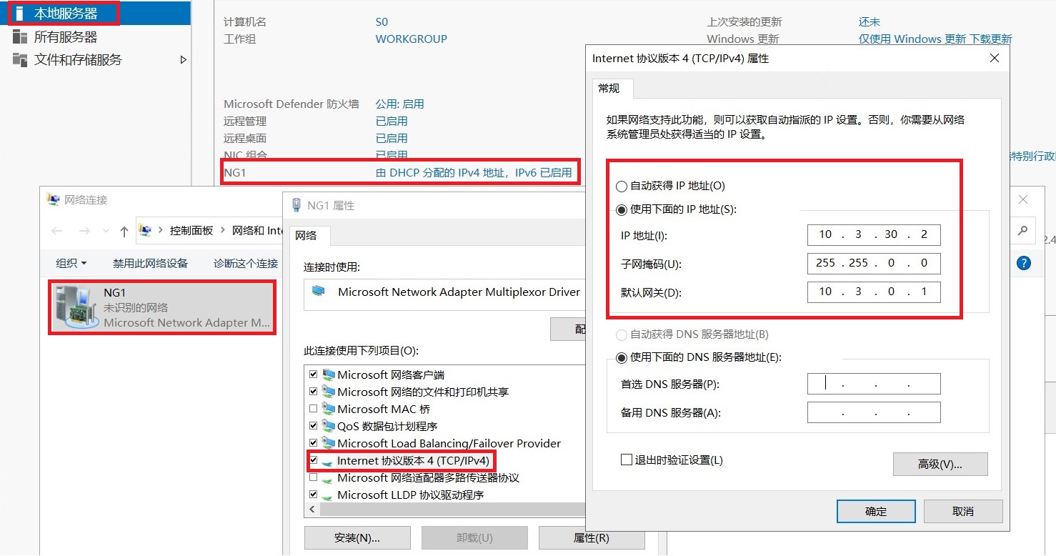 将 Hyper-V 角色添加到三个节点后,必须重新启动它们。重启后,三个节点就会多出两个虚拟网卡,物理网卡的IP就会消失。第一次,将这两个虚拟网卡的IP设置为一开始配置的IP。另外两个物理网卡不用动,三个节点都必须设置。 S1 的 DNS 应指向其自身。 S2和S3的DNS仍然指向S1。